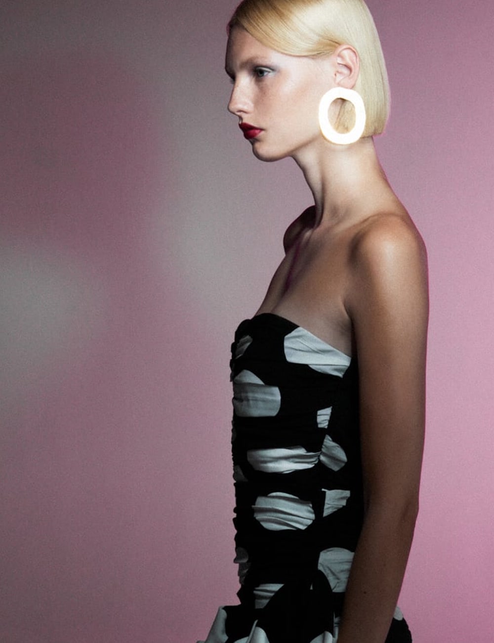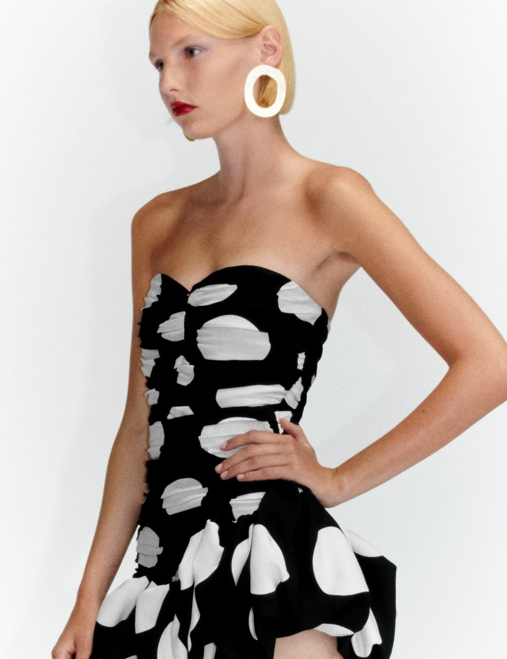 Cotton-blend fabric. Textured fabric. Long design. Evasé design. Wrap collar. Puffed short sleeve. Front slit. Knot detail. Bow closing on the back.